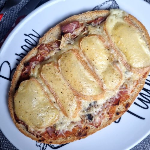 Tranche de pain de campagne ou rustique, coulis de tomates, jambon blanc, maroilles, champignons de paris, emmental râpé, thym