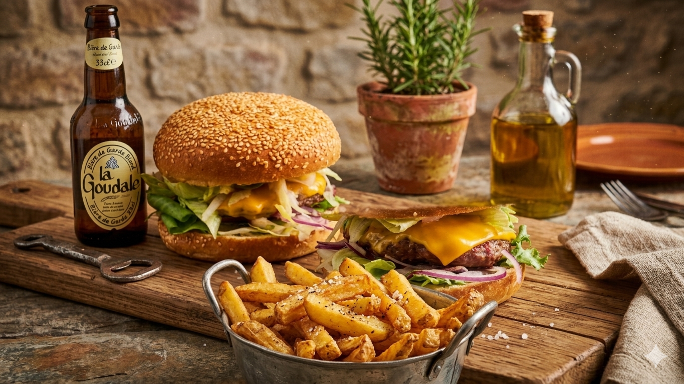 Pain, salade, tomates, oignons rouges, steak haché (150g), fromage (Maroilles ou chèvre ou Camembert ou Fourme d’Ambert), sauce burger maison