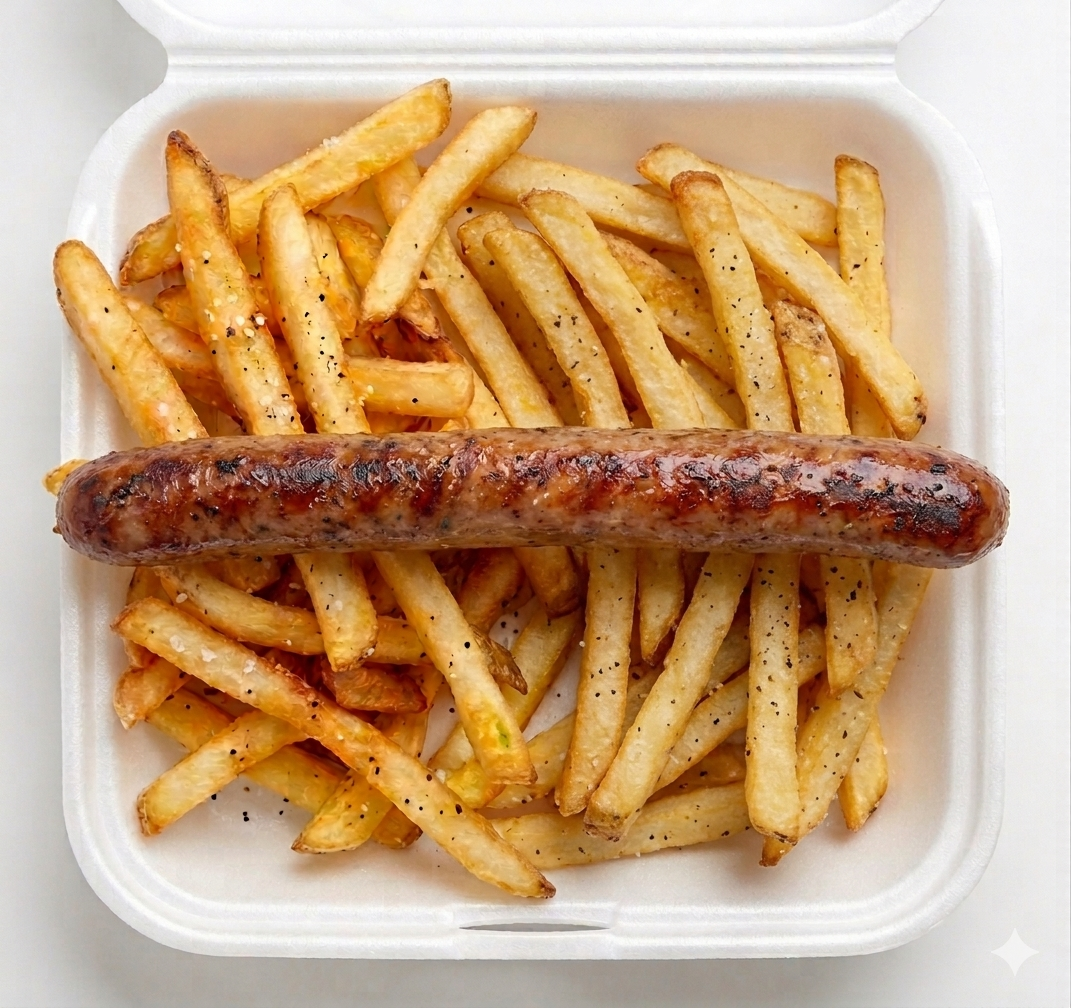 Pain artisanal, saucisse ou merguez, frites, sauce au choix